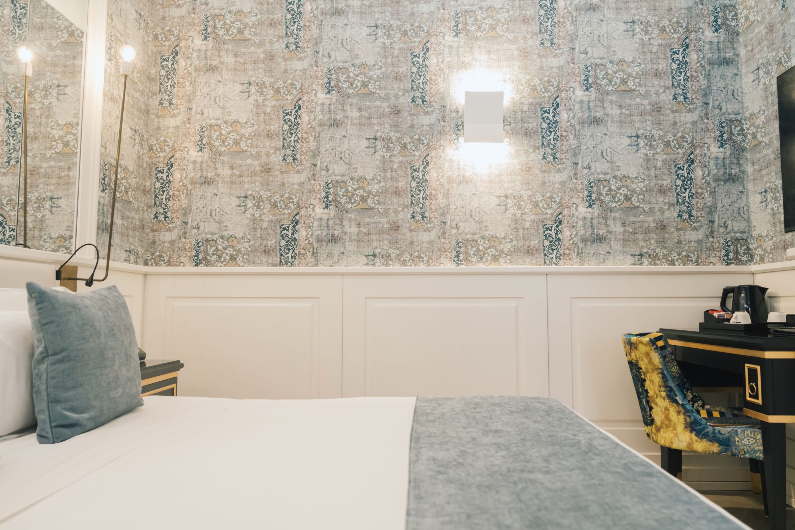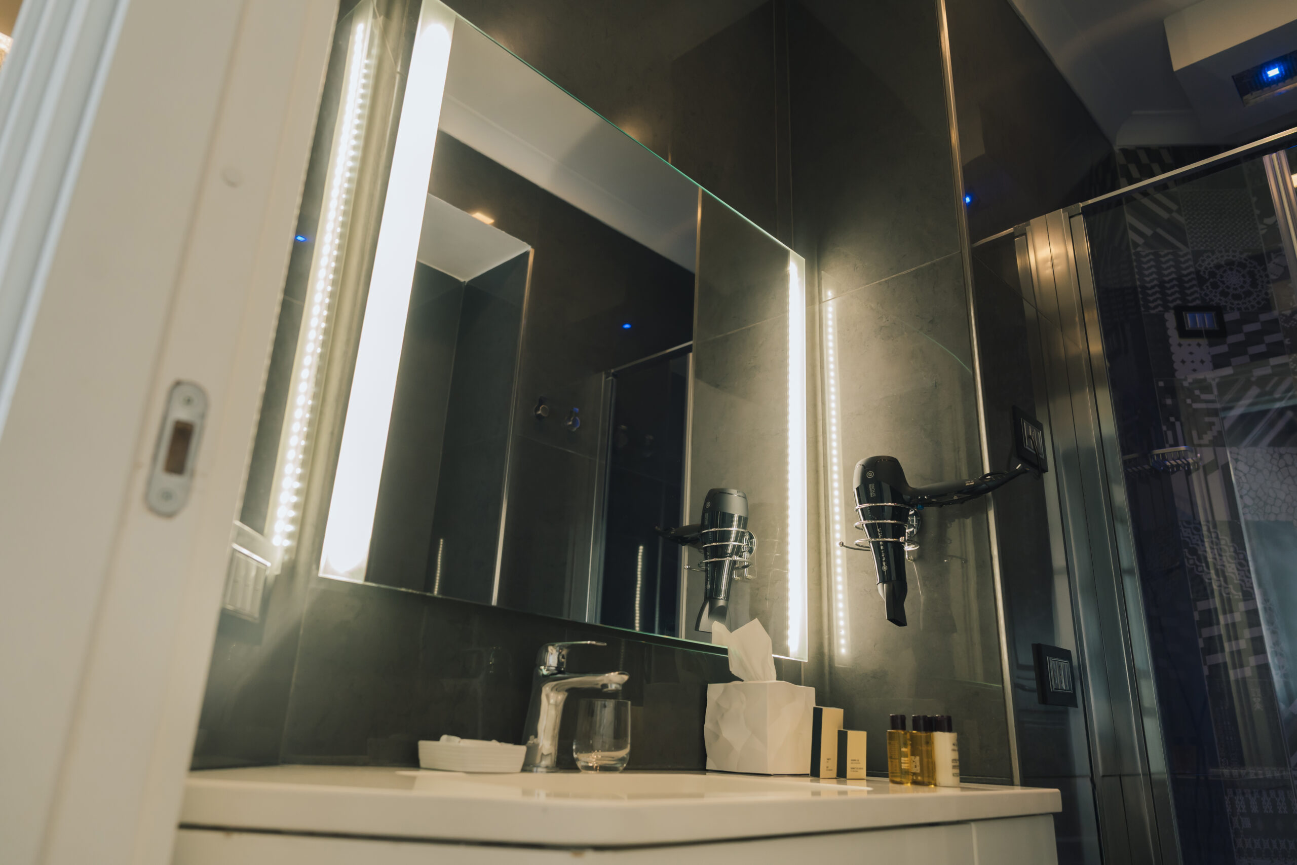 camera con arredi moderni, finestra affacciata su un cortile privato e bagno privato con doccia sensoriale e set di cortesia.